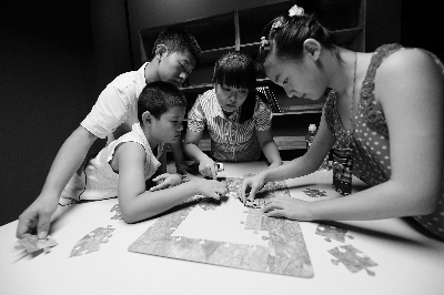 8月20日,陕西历史博物馆举办的“巧手良医——陕西历史博物馆文物保护修复工作展”在西安正式对公众开放。展览内容和形式突破传统理念,邀请公众全程参与、体验文物保护修复工作。图为游客在陕西历史博物馆馆员的帮助下完成一件壁画拼图。新华社记者 李一博 摄