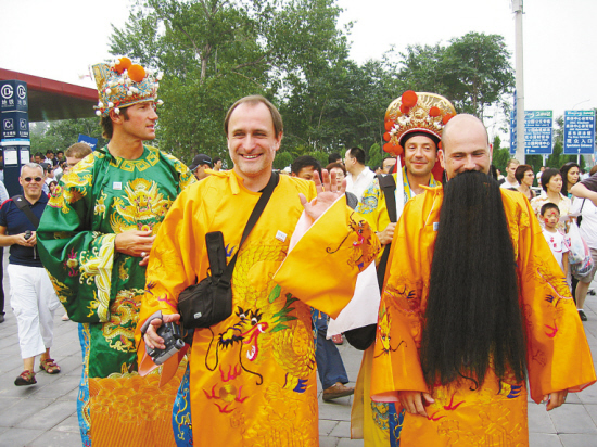 中国传统文化吸引了众多外国客人,图为奥运会开幕式前国家体育场外穿着中国戏曲服饰的外国观众。本报记者 黄小驹 摄