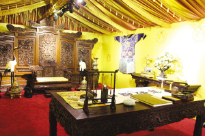 走进小屋,迎面看到的是“金銮宝座”,宝座后面摆有五爪龙屏风,宝座两旁是两只亭亭玉立的仙鹤,宝座上摆放着一只景泰蓝的如意,宝座两边的墙上挂着两件“京绣”的黄色和蓝色皇袍。据小屋的总设计师刘小宁介绍,“金銮宝座”的摆设和故宫太和殿里的一模一样,只是比太和殿的小了一圈。