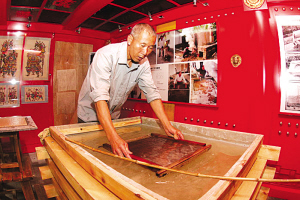 在小屋的一侧摆满了造纸的各种用具,来自陕西西安市北张村的造纸师傅现场演示了用樟树皮造纸的过程,游客也可以亲自参与其中,而且现场造出来的纸张还将用来印制陕西特有的木版年画,这些年画剪裁后将送给游客。
