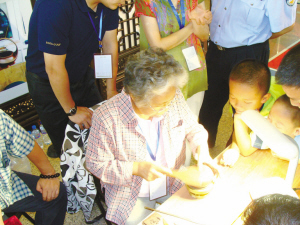 记者来到展厅一层宜兴紫砂壶的展区时,汪寅仙正在兴致勃勃地向聚集的观众演示制作壶身的工序,一团紫砂泥在她手里用竹篦和刀片拍了又抹,光洁可鉴。一个小孩问:“像个面包。这是真的面包吗?”边上的观众逗他:“对,瞧这面包上抹的都是巧克力。”大家笑开了。