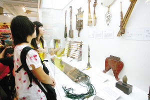 一进二层“非遗”展演的展厅,就可见到中国艺术研究院收藏的一张古色古香的南宋“鸣凤”琴。古人弹琴,要静坐焚香,而展厅里人声较杂,自然不适合弹琴。