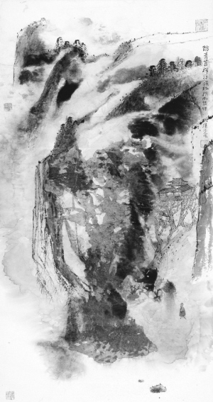 第一,色与墨的结合;第二,抽象与具象的结合;第三,块面和线条的结合。他的泼彩要比张大千更丰富,大概在国外时间更长一些,里面有一些中间色,所以显得更丰富些。在抽象与具象中,表现在山石结构,山和树、人物方面。泼彩方面的结合,我注意到了线,大概是因为他的书法很有功底,在团块结构的中间,不断有一些很挺拔的线条,对于画面的活泼、跳动起了很好的作用。还有一点,整个画面无论从团块结构和抽象具象来说,不是浮在表面的,而是力透纸背,既厚重又结实。