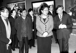 刘延东首先参观了布展于中国美术馆三层和五层的规模宏大的“寻源问道——油画研究展”。该展览汇集了中国油画30年来最具代表性和影响力的老中青三代艺术家代表作260余幅。吴冠中、靳尚谊、詹建俊、朱乃正、钟涵、侯一民、艾轩、杨飞云、王沂东、罗中立、何多苓、陈丹青、刘小东等著名画家作品齐亮相。这些作品不仅是画家个人风格鲜明的作品,也是近30年来中国油画经典和标志性的作品。在美术馆一层展厅,刘延东还参观了“2005—2008·中国百家金陵画展”。该画展创办于2005年,在江苏南京已连续举办了4届。此次在中国美术馆展出,主办方精心遴选出151幅作品,其中有2005年至2008年4届中国百家金陵画展的获奖作品40幅,2008年中国百家金陵画展(油画)入展作品90幅及特邀油画名家作品21幅。刘延东一边仔细欣赏这些作品,一边向陪同参观的中国美术家协会主席刘大为、中国油画院院长杨飞云等了解展览及作品的情况,并不时对许多艺术家在其作品中的精心创造给以肯定。