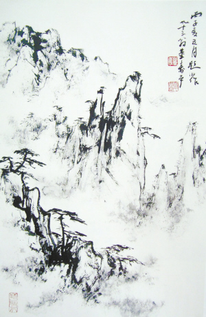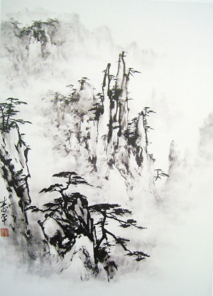 他画黄山,并非实写黄山景致,我们很难“对号入座”。那是一种概念化的景物,奇峰、老松、云雾,通过画家苦心经营,呈现万千姿态, 我们似曾相识,又难以指认。