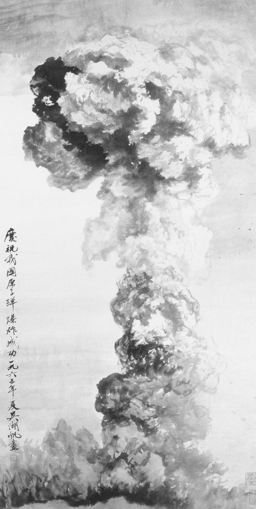 1964年,我国第一颗原子弹成功爆炸后,吴湖帆看了几次纪录片,又研究彩色照片,用平时点染妙笔,绘成这幅《庆祝原子弹爆炸成功》。当时此画展出时,有参观的解放军在意见簿上提出要求:“请把这幅画制版,印为宣传品,以供群众购赏。”其影响之大,可想而知。吴湖帆在新中国成立后备受礼遇,其代表作有《峒关蒲雪图》、《庐山小景》、《写米芾诗意》、《芙蓉映初日