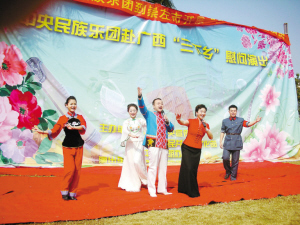 本报讯 1月11日,中央民族乐团一行60余人奔赴广西壮族自治区进行文化“三下乡”专场演出。乐团此次共派出两支演出队,由团长席强、党委书记董天恒等4名团领导亲自带队,分别前往广西玉林市、贵港市桂平县、百色市、崇左市龙州县、百色市平果县、田东县等地举行10场慰问演出。