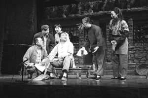 《日出而作》分三幕。写上个世纪太行山足下一个生产队的一天:上午、下午、晚上。故事以“三一律”的形式,按时间顺序展开。作者把生产队的各种人物聚集在生产队队部兼牲口棚里,目的不是挖掘其中一个或两个具有鲜明性格的人物形象,而是“人像展览式”的让观众观赏当年农村最基层行政单位——生产队的一群普通农民的生存状况和心之向往。他们是:爱社如家的陈老炳,爱庄稼如命的“坏分子”赵有常,有搞经济流通本领的“投机倒把分子”崔长利,下山找男人的单干户金大翠,德高望重的老烈属土改妈朱大娘,被生活拖累得疲惫不堪的杜二嫂,有娶了富农子女的城里人马克平,有被阶级路线边缘化但骨子里有股狠劲儿的周祥善,有我当年的同龄人死了的和活着的小梦姑娘……众多的人物和众多的事件在营造戏剧情境高手的刘锦云笔下,人物以或并列或交错的运动态势呈现出当年河北农村生活的原生态。人物各自的风风雨雨、悲悲喜喜的人生遭际,以及其中社会因素的心理含量常常打动我、震撼我。从清晨到午夜的一天之间汇聚而成的生活断面让我体味出当年农村真正的精神底蕴。剧本一方面揭示当年农民生活的艰辛,一方面歌颂农民的勤劳善良。古人所谓:“人有其性情,人有其气质,人有其形状,人有其声口”(金圣叹《水浒传序三》),剧本在这方面下足了功夫。作者熟练地操作着他那经过提炼的河北方言,亲切地描绘河北乡村的历史风貌和人文风貌。写赵有常对庄稼的深情台词尤如带着泥土芳香的诗;写陈老炳的志趣情调,台词则俗中寓雅、雅中若俗;写行走于江湖的配种员焦师傅与劁猪的吴师傅,台词幽默诙谐、俗笔出之;写金大翠追求陈老炳的台词则干脆利落掷地有声、亦雅亦俗……几副笔墨的灵活变换,形成了《日出而作》在文学语言上的美学追求。这种在语言上的乡土气与书卷气的互相渗透使人物细腻逼真、自然传神。让我自然地在往事如烟和往事并不如烟之间行走,剧中的场景渐至清晰至呼之欲出。