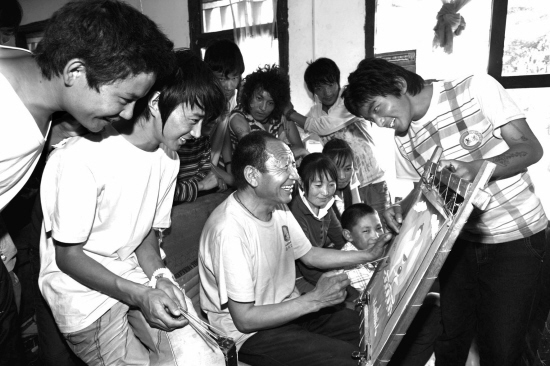 7月19日,在拉萨市西藏自治区文化产业基地——岗地-拉姆拉卓唐卡艺苑内,唐卡画师索朗久丹正在和学生们愉快地交谈。 西藏唐卡是用矿物颜料绘制并由彩缎装裱成的一种卷轴画,具有鲜明的藏民族特点、浓郁的宗教色彩,历来被人们视为高原珍宝。如今,这种藏民族的艺术奇葩在西藏各地得以传承。 本报记者 喻非卿 摄