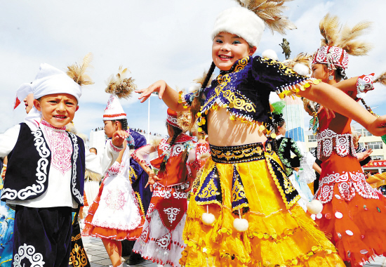 8月30日,新疆阿勒泰地区青河县16个民族的13288名农牧民共舞哈萨克民族传统舞蹈“卡拉角勒哈”,用自己的方式庆贺即将到来的祖国60华诞。“卡拉角勒哈”是哈萨克语,意为“黑色的走马”,最初是一种哈萨克人用来模仿马的走、跑、跳等姿态的简易形体舞蹈,逐渐演变成了哈萨克民间舞蹈的代名词。图为孩子们在广场上跳起了欢快的“卡拉角勒哈”。新华社记者 何 军 摄