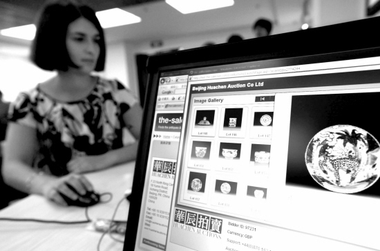 9月11日,华辰鉴藏拍卖会(第十期)在北京举槌,此次拍卖会上,北京华辰将通过与英国古董网(the-saleroom.com)合作,首次实行网上同步拍卖。图为英国古董网的工作人员在演示网络拍卖方式。 网上同步拍卖是指网上竞价与拍卖现场竞价同步进行,拍卖师在拍卖一件标的时,需要面对现场竞价、电话竞价和互联网网上竞价三方的同时参与,拍卖进程也会通过互联网向全球买