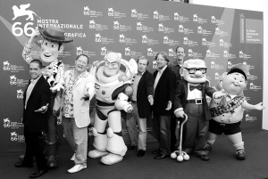 图为五位获奖的动画片导演与动画人物一起亮相威尼斯电影节。左一为李·昂克里奇,左三为约翰·拉塞特,左五为布拉德·伯德,左六为安德鲁·斯坦顿,右二为皮特·多克特。