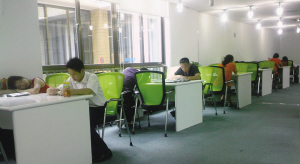 隔壁的中小学生阅读区也不能幸免。自上午开馆起,就有成人读者三三两两落座其中,及至正午时分,越来越多食罢午餐的上班族涌入少儿图书馆。有的打开手提电脑开始办公,有的或仰面或伏案酣然入梦,偶有一两对情侣窃窃私语。而学生阅读区真正的服务对象——少儿读者们,在这里取得自己所需的书籍后,却只能选择离馆或去较远的阅读区。