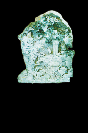 巨型翡翠雕塑《重上井冈山》材料系缅甸冰种高档翡翠籽料。质地致密细润,通体光泽柔和、明洁。色彩或呈豆绿带春色,或呈姹紫。