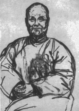 这样的素描就表现为一种概括、一种艺术表现,它不仅仅是一个轮廓,而且是通过肌肉达到骨头,深入到皮内,对内部形状研究之结果。人体的普遍的和本质的结构是由骨骼的位置决定的,这些骨骼和肌肉一起给了动势,所有这些都在明暗之前。明处和暗处可以通过素描的表现,用较强的或较弱的线条的重点来代替。我们从素描观点以及与几何形物体的对比出发,达到形状的表皮本身这面。因此如果我们要表现,就要像在医学上做手术一样,把表皮揭开看看内部是什么,因为一切外面的东西都是由其内部的位置决定的。正像人们穿着衣服时,所有衣服的衣纹都是由底下的形状决定的,因此在一个人体模型上的衣纹和在一个活人身上的衣纹就不同。