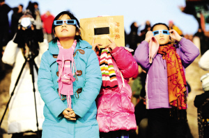图三:几名小女孩在青岛西大洋休闲渔村观测点观看日环食。
