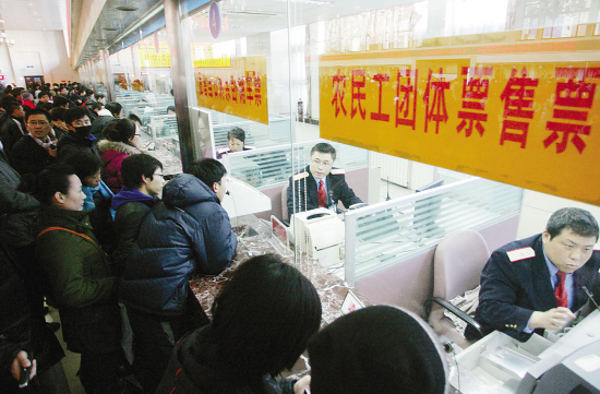 春运期间,为便民利民,北京站开设农民工售票、方便残疾人的无障碍售票等专区窗口。图为北京站开设的农民工团体售票客口。 本报记者 卢 旭 摄