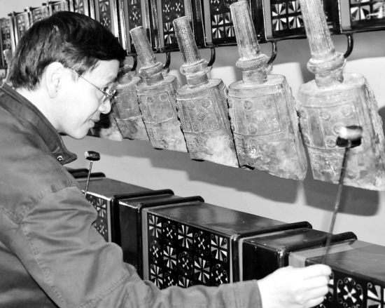 1月25日,中国古代科学技术展在澳门科学馆举行,展出超过100件展品,涵盖天文、火药与武器、造纸、印刷等具有代表性的中国古代科技制品。图为工作人员在中国古代科学技术展上演示编钟演奏。 新华社记者 张家伟 摄