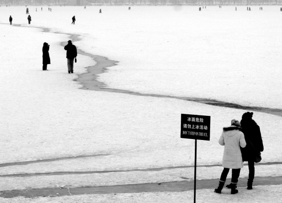 40年不遇的寒冷天气,把湖面冻得结结实实。眼下,在北京许多公园内,封冻的湖面成为人们嬉戏的场所。在此还是要提醒人们:冰面危险,请勿上冰活动。本报记者 喻非卿 摄