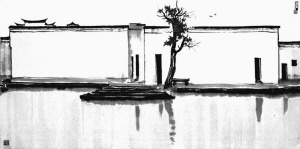 这静巷冷清清,隔绝外界自成一统,似乎空无所有,却含蕴着形式美感之微妙节奏,低音吐柔情。缓慢的“弧”与“曲”是画面主调,墙头、墙脚、左方远处的山墙、墙里伸出的树枝,都参与了弧与曲合唱,严肃认真,绝不让走调。一片弧曲腔中镶嵌进来小小的黑方块,正方的、长方的小小黑色浓缩之块块,在行人眼里,它们不过是墙上全不起眼的洞或远处几个窗,但在这小巷的绘画天地里,她们对照全局的弧与曲,平衡整个画面大量的白。如果秤的一头是许多弧曲枝条,是大块大块的白,那么这几个小小的、方的、墨黑的秤锤恰好使秤获得平衡。