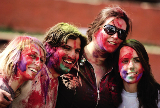 按照洒红节传统习俗,尼泊尔人会在自己的脸上和身上涂抹颜料,还向别人身上抛撒彩色颜料和粉末。图为2月28日,在尼泊尔首都加德满都,庆祝洒红节的人们脸上色彩斑斓。(新华社发)