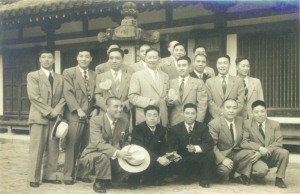 图一:吴鸣申(中右三)与梅兰芳、李少春(中左三)等访问日本时合影。