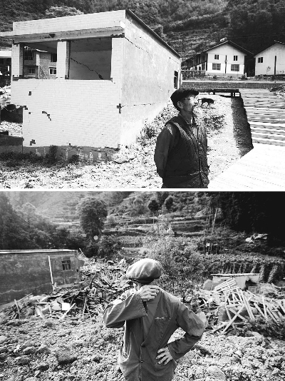 2010年4月30日,80岁的杨林生老人在新家附近遥望远方。他身后是地震中被毁坏的房子,如今已经纳入东河口地震遗址保护范围,不远处是重建的木结构新房。(新华社发)