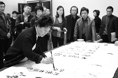 近日举行的北京书协第五届三次理事会,在北京书协主席林岫的倡议下,压缩会议程序,变成了为青海玉树地震灾区献爱心的捐赠笔会。林岫率先开笔题写“玉树关情”,北京书协主席团王家新、黎晶、彭利铭、孟繁禧、龙开胜、刘俊京和各位理事先后挥毫长卷,用笔墨表达了书法工作者对玉树灾区的慰问之情。京 书 摄