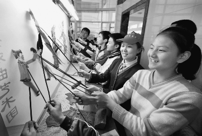 5月18日,安徽宣城市水东“皖南皮影馆”和宣城供电“宛陵阳光”青年志愿者带着一场形式别样的电力安全知识皮影戏来到宣城市特殊教育学校,为残疾儿童们演出,并向他们捐助了学习用品。图为宣城供电“宛陵阳光”青年志愿者们手把手教残疾儿童操作皮影。(新华社发)