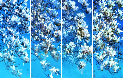 靳之林的油画用笔很特别,他用毛笔而非油画笔作画,作品又多以写生的方法呈现,而对民间文化的深厚造诣,使得他笔下的海棠花、白玉兰等,在气韵贯通之处,无意中形成油画画幅与国画中四尺整纸的条幅相一致的局面。因此,在形式上,靳之林开创了油画四条屏的探索,作品别具一格,独成面目。