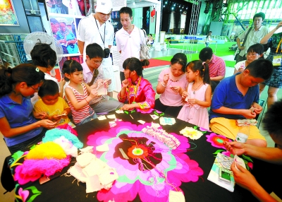 7月24日,上海世博园宝钢大舞台中国元素传习区举行中国民间艺术小课堂活动,游客在民间艺术家的指导下学习和体验多种民间工艺制作,领略传统文化的魅力。图为游客在学习羌绣工艺。新华社记者 聂建江 摄