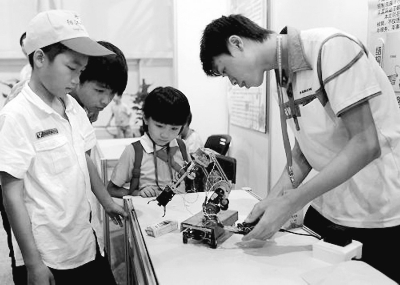 8月9日至12日,第25届全国青少年科技创新大赛在广州举行。本届大赛吸引了来自全国31个省、区、市以及新疆生产建设兵团、军队子弟学校和香港特别行政区、澳门特别行政区等35个代表队的500多名学生参加,共有391个学生创新项目和200个科技辅导员创新项目参加本届大赛的评选活动。图为来自广西浦北县寨圩中学的黎福曜同学(右一)在展示自己发明的关节式机械臂。新华社记者 卢汉欣 摄