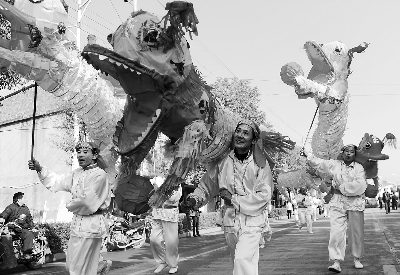 11月27日,江西省乐平市举行农民文化艺术节,来自全市各乡镇的22支农民演出队在游街表演中展示了独具本土特色的民间文艺节目,吸引了数万名群众前来观看。图为农民演出队在表演手狮舞。