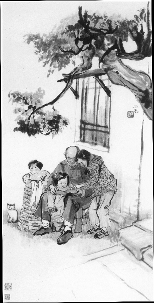 秋风拂过,伸出院墙外的老树枝丫上,叶子黄了一半。家门外的老树下,坐在石墩上的爷爷等来了放学归来的孩子们。他们一脸兴奋,正认真地教不识字的爷爷认字,那在一旁观看的最小的孩子一脸好奇。这幅作品名为《给爷爷补课》,由谢之光创作于1958年。看似简单的场景,充满童趣,让人感受到亲情的温馨与充满希望的未来。素有画坛“怪才”之称的谢之光,国画造诣深厚,尤工仕女画,他笔下的人物形神兼备、栩栩如生。他曾执教于上海美专,也曾在上海中国画院收入室弟子,多有学生受益于其散淡教育和艺术观点。他曾对学生讲,对于古画“钻进去要出得来,你临得像,不要结壳,要破壳变成自家的面孔,才算有出息”。这一观点言简意赅而落拓无羁,如今看来仍是字字珠玑。