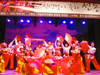 1月8日至13日,首尔中国文化中心紧扣“欢乐”主题,在韩国成功举办了“欢乐春节——中韩缘文化节”系列活动。由广西歌舞剧院和青海省民间民俗艺人代表团参加的民俗文化展、民间艺人演示和中韩联合文艺演出等活动内容丰富、形式多样、雅俗共赏,在韩主流社会和普通民众中产生了良好影响,获得了普遍欢迎和好评。
