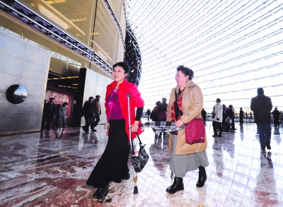 图为来自北京残疾人合唱团的董淑芬(前左)和吾运红在国家大剧院参观。新华社记者 罗晓光 摄