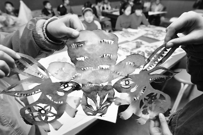 近日,山东淄博少儿美术中心开展“乖乖兔染色剪纸”活动,孩子们用宣纸剪出各种兔子图案,并用水彩着色,喜迎新年。图为淄博少儿美术中心的孩子展示自己创作的剪纸作品。(新华社发)