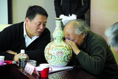 多位文博界资深专家出席会议,就日前利用传统工艺成功仿制的宜兴胎褐釉地施珐琅彩葵花式壶、粉彩饕餮纹带托爵杯——江山一统和浅黄地洋彩锦上添花万寿连延图长颈葫芦瓶3件清代极品陶瓷进行研讨。