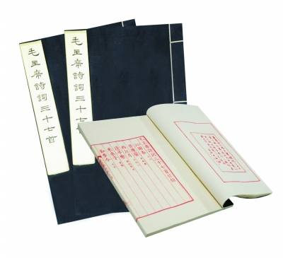 为纪念毛主席诞辰117周年,文物出版社按照1963年版《毛主席诗词三十七首》朱砂特装本原班工艺、材质重新印制的书目于近日出版。据悉,1963年版的朱砂特装本是当年专供毛主席收藏和赠送友人使用的极为珍贵的书籍。该书运用“御制”云纹宣纸定制,朱砂调墨珂罗版印刷,特制纯丝封面,无论在工艺、还是在设计上都代表了当时新中国最高印制水平。