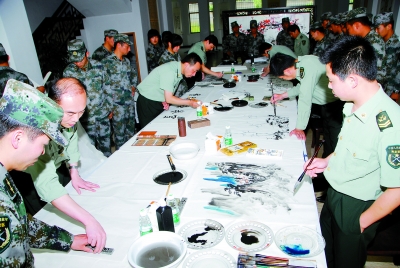 在每站5至7天的展出过程中,书画家们与广大基层官兵一同欣赏,耐心地给他们讲解作品的构思、布局、手法等,应该从哪个角度去欣赏,同类作品如何欣赏,作品为什么好,好在哪里等。官兵们屏息聆听,有的认真笔记,有的悄声提问,有的在书法作品上比划,有的在作品前留影,还有的在水墨国画前沉思。对于基层部队美术书法创作骨干,则邀请他们和书画家们一起现场创作。基层大部分美术书法创作骨干和军区美术书法研究院建立有联系,有的还是艺委会委员,还有一部分在巡展前就请各部队进行摸底、收集,通知他们届时参加。基层创作骨干和书画家们共同临池,互相切磋,书画家对创作骨干的作品进行点评,创作骨干把内心埋藏已久的困惑和盘端出,书画家们把多年积累的创作经验,从用笔用墨用纸到技巧技艺,直至艺术思想理念的表达毫无保留地悉心指导,经书画家们精心辅导,许多创作骨干心里豁然开朗。驻漳州某部政治处干事郭裕文和书画家们一起创作交流时,感慨地说:“这次军区书画家作品进军营活动,不但把平时难得一见的高层次书画作品送到基层,更是把高规格的书画艺术欣赏与创作会开到基层,让我们饱了眼福,开了眼界。”