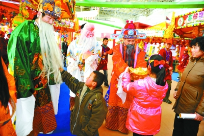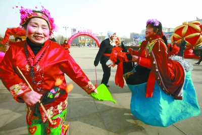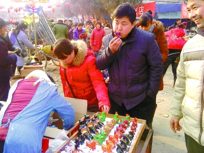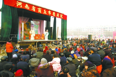 除庙会外,唱大戏是豫东平原上另一道可口的新春佳肴。正月初二一大早,58岁的耿起云大妈就来到商丘帝和水上公园,市豫剧团正在这里上演精彩剧目。虽然当天的气温还不到10摄氏度,但通俗质朴、颇具地方特色的豫剧还是吸引了众多市民和游客驻足观看。耿大妈告诉我,她最难忘的就是小时候搬着长条板凳去村头看大戏的场景,虽说如今的日子越过越红火,看戏已是家常便饭,但她还是流连忘返于每年春节公园里的露天大戏台,总觉得“这里有年味”。寒风里,演员们身着单薄的衣衫唱得有板有眼,观众的热情和新年的喜庆早已融化了寒冬,迎来了2011年的春天。