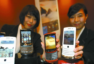 2月9日,加拿大RIM公司在韩国首尔举行黑莓Torch 9800智能手机发售仪式。该机是首款滑盖黑莓手机,也是第一款采用BlackBerry 6操作系统的黑莓机型。用户可根据自己的喜好选择触摸屏或键盘、触控板操作。图为模特在展示黑莓Torch 9800智能手机。 新华社记者 何璐璐 摄