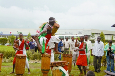 从坦桑尼亚到布隆迪,飞机要经停肯尼亚。艺术团早晨3点便赶到机场,所乘坐的航班5点起飞,在内罗毕机场停留六七个小时,到布隆迪首都布琼布拉时,已是午后。艺术团成员疲劳之极,但一下飞机,先是被使馆和布方热情周到的接待所感染——郁大使等使馆的同志和布隆迪青年、体育与文化部部长尼耶尼米加博等到机场迎接,之后更被布隆迪打鼓队的激情所鼓舞。