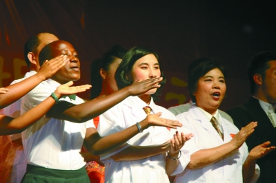 在中国驻坦桑尼亚大使馆做演出排练时,中国艺术团的民乐、演唱和坦桑尼亚艺术家的舞蹈都很精彩。但中间一个节目,令在场的人感受最深。十来位身穿白大褂、左胸缀有鲜艳五星红旗的医务人员,和十来位上穿短袖白衬衫、下穿墨绿色裤或裙的青年,交叉组合成两排,用中文和斯瓦希里语唱起一首歌,是那样深情而又悠扬。