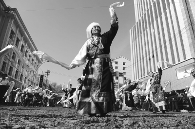 2月14日,青海省西宁市举办大型社火巡演,来自社会各界的5000多名群众参加演出。精彩纷呈的节目吸引数万名西宁市民观看,给高原古城增添了快乐祥和的节日气氛。图为一名藏族老人在跳锅庄。新华社记者 张宏祥 摄