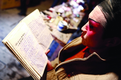 2月10日,青海省湟中县田家寨镇什张家村业余秦剧团一名演员正在演出前温习台词。青海省湟中县田家寨镇的什张家村秦剧团是一支有着百年历史的农民业余剧团。近年来,在周边的许多农民业余剧团因经费不足、设备简陋、演员缺失等问题纷纷解散的情况下,什张家村农民业余剧团利用微薄的自筹资金,每年为邻近的乡村演出数十场,艰难而执著地延续着乡土艺术,丰富了当地农民的文化生活,受到农民群众的欢迎。(新华社发)