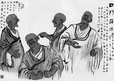 《四阿罗汉》现藏江苏美术馆。该图纵76.5厘米、横105厘米,作于1942年。1937年“七七事变”后,作者率正则学校部分师生员工自江苏丹阳辗转西迁四川,亲自体验到国破家亡的苦难遭遇,激起他抗战救国的爱国热情,也给他的艺术创作增添了新的题材和内容,为他的人物画创作开辟了新的空间。在此期间,他作为艺术家,以画笔来反映中华民族在日寇铁蹄下遭受的灾难,人民大众因战争而逃亡的苦难,或借佛教人物故事来嘲讽、抨击时弊,为民众呼喊,这一阶段的作品有《四阿罗汉》、《流亡图》、《敌机又来矣》、《纤夫》、《逃难》等。在《四阿罗汉》中,作者借取佛学中悲天悯人的故事,以四阿罗汉嬉、怒、悲、愤的情态来嘲讽战时当局政事的腐败和不恤民意。(苏 文)