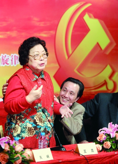 身着鲜红外套的老一辈艺术家王昆在欣慰地听完院长、团长们的讲话之后,以新歌剧《白毛女》制作人的身份发了言。所有的目光都集聚到这位不老的“喜儿”身上。王昆在阐述了为什么要在这个崭新的时代重新把《白毛女》推上舞台之后说:《白毛女》最伟大的意义在于,它道出了这样的箴言——农民要翻身!著名词作家赛克当年对王昆说过的话一直铭记在她的心头。赛克说:我不是共产党员,但是,我觉得《白毛女》是属于全党的。现场响起了热烈的掌声。