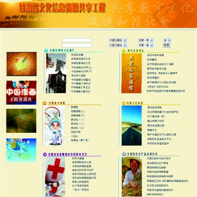 甘肃是多民族交汇融合的地区,也是我国历史上经济开发,特别是农业垦殖和古代文化发展较早的地区之一,是形成中华民族灿烂文化的重要发祥地之一。“十一五”期间,全国文化信息资源共享工程甘肃省分中心充分挖掘甘肃特色资源,先后建成了《甘肃陇剧专题资源库》、《甘肃石窟艺术专题资源库》、《文溯阁<四库全书>在甘肃专题资源库》、《<兰州往事>专题资源》、《甘肃省文化旅游专题资源库》等12个特色资源库。只要点开甘肃省文化信息资源共享工程的网页(www.gxwhgx.cn),就能浏览到这些资源。
