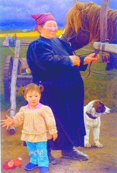在技巧上,我注重画面的体积感和三维空间,强调色彩的丰富性和明暗对比的表现性,追求一种强烈的视觉冲击。我要在画面上体现一种安详而沉静的意境,作品以宽阔的大草原为背景,不时地会出现些牛、马在背景中;进出的草地则是整中乱、乱中整的笔触自由放达。我是想把动与静、趣味与人物画结合起来,在借鉴古典和印象派画风的同时体现出一种浓郁的草原气息。在创作中尽量挖掘油画语言的表现空间,强调视觉的直观性与含蓄诗意,力求在原生态的现实中,反映出一种独特风韵的牧民生活,让人感到一种东方式的温润美感。